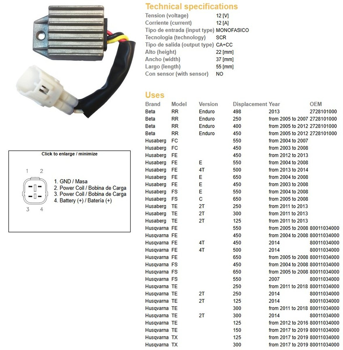 Dze regulator napięcia ktm exc 125 98-13, exc200/250/300 05-13, exc250/400/450/525/530 05-11 (80011034000) (12v/12a) (801103400) (sh721aa)