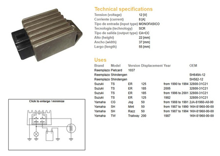 Dze regulator napięcia suzuki ts 125er '90-'94, yamaha jog50 (1kh-81960-00-00, 32800-31c21) (sh582-12, sh649a-12) 12v/18a