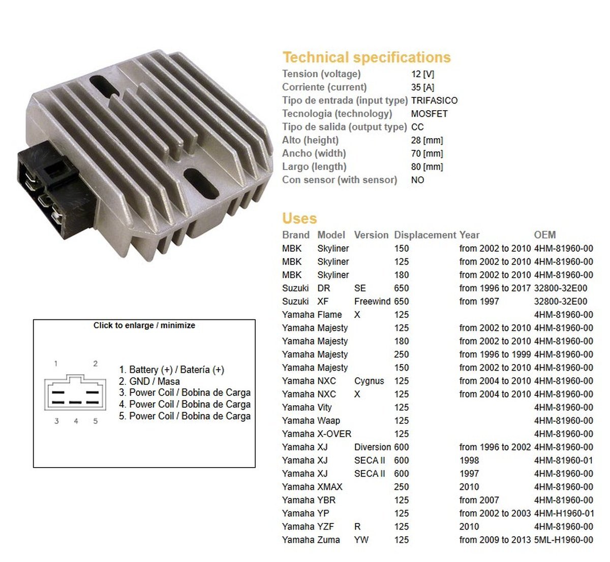 Dze regulator napięcia yamaha xj600 diversion 96-02, ybr125, yzf125r, majesty 125/250 (4hm-81960-00), suzuki dr650se 96-17 (32800-32e00) (12v/35a) (esr272)