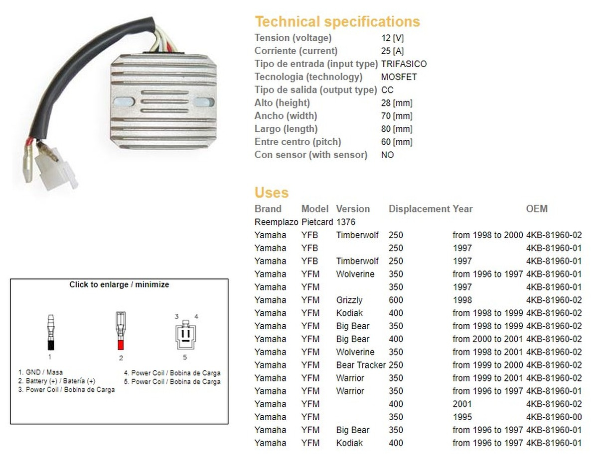 Dze regulator napięcia yamaha yfm 350 big bear '96-'99, warrior 350 '96-'01, wolverine 350 '95-'01, yfm 400/600 (esr633)