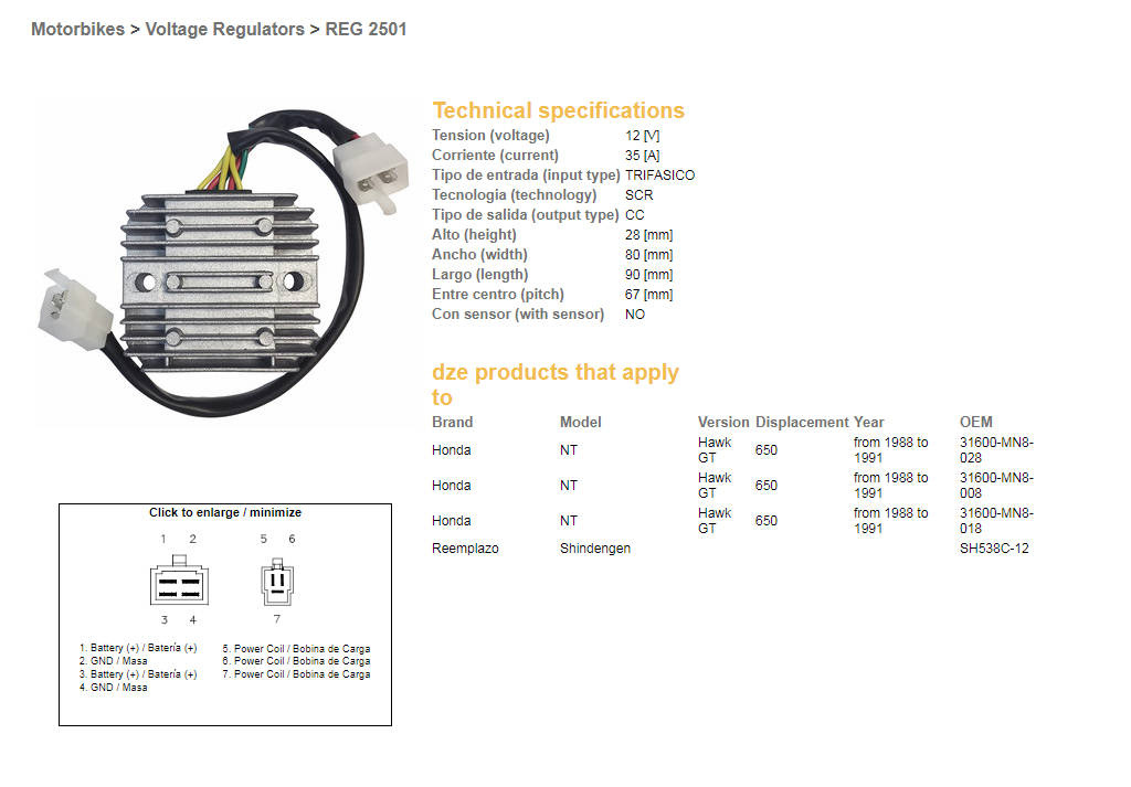 Dze regulator napięcia honda ntv650 '88-91 12v 35a (sh538c-12) (31600-mn8-008) (31600-mn8-028) (esr252)