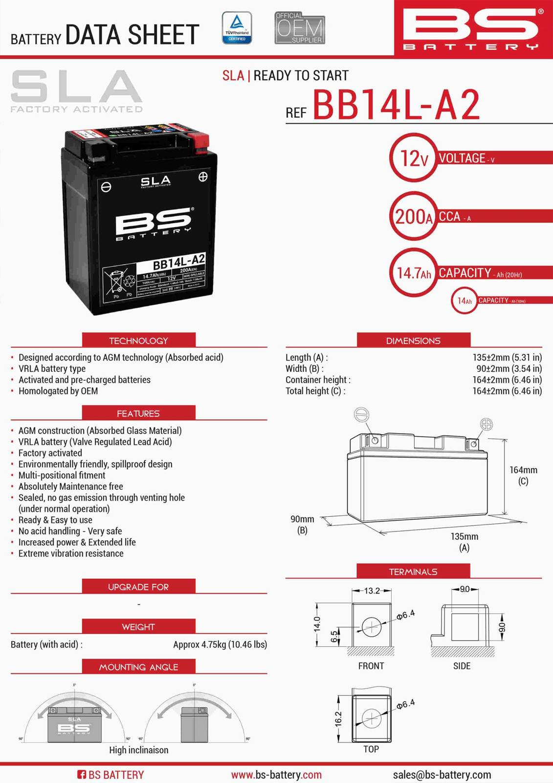 Bs akumulator bb14l-a2 (fa) (yb14l-a2,yb14l-b2) 12v 14ah 135x91x167 bezobsługowy - zalany (210a) (4) - zastępuje 300835