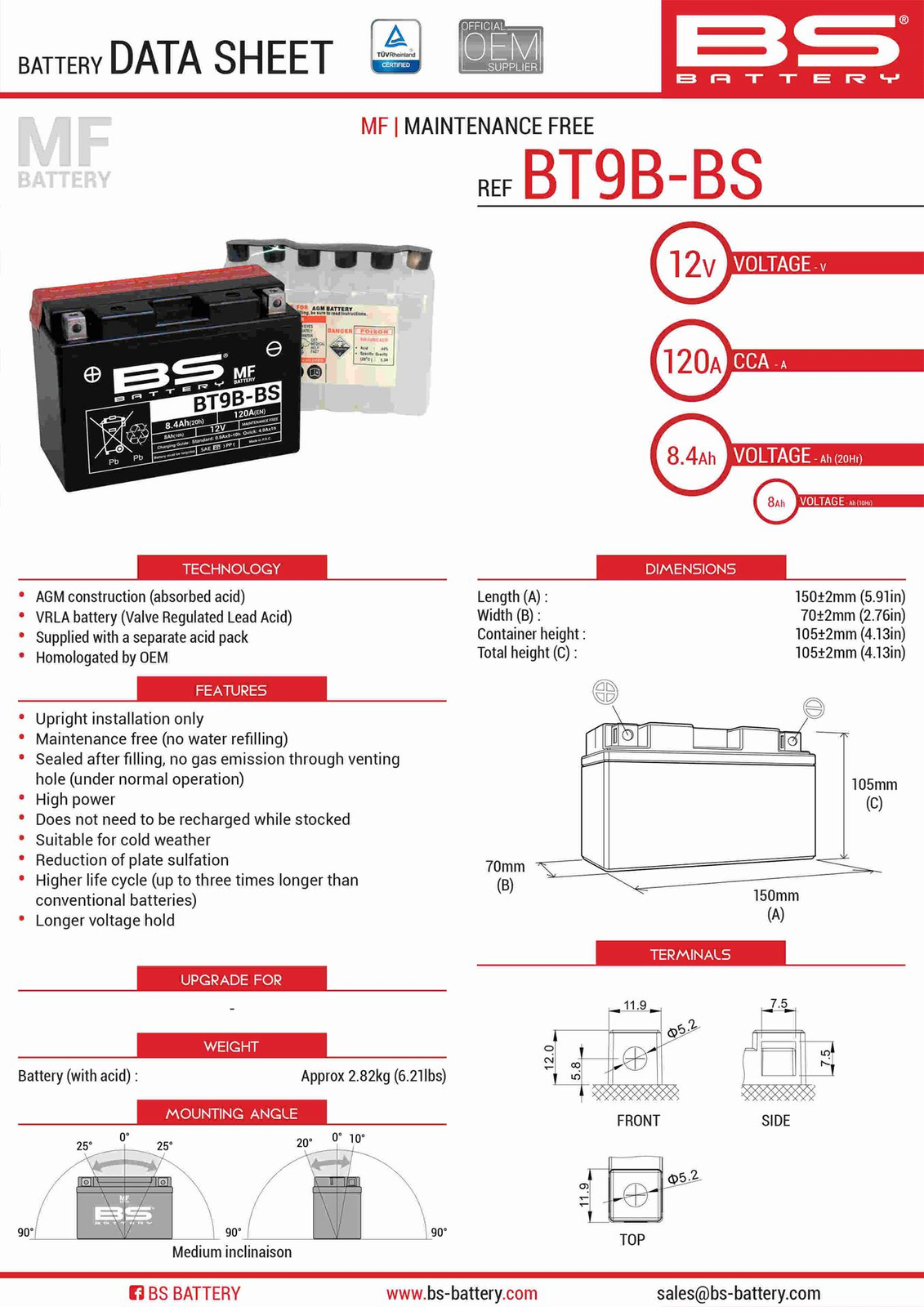 Bs akumulator bt9b-bs (yt9b-bs) 12v 8ah 150x70x105 bezobsługowy - elektrolit osobno (120a) (6) ue2019/1148