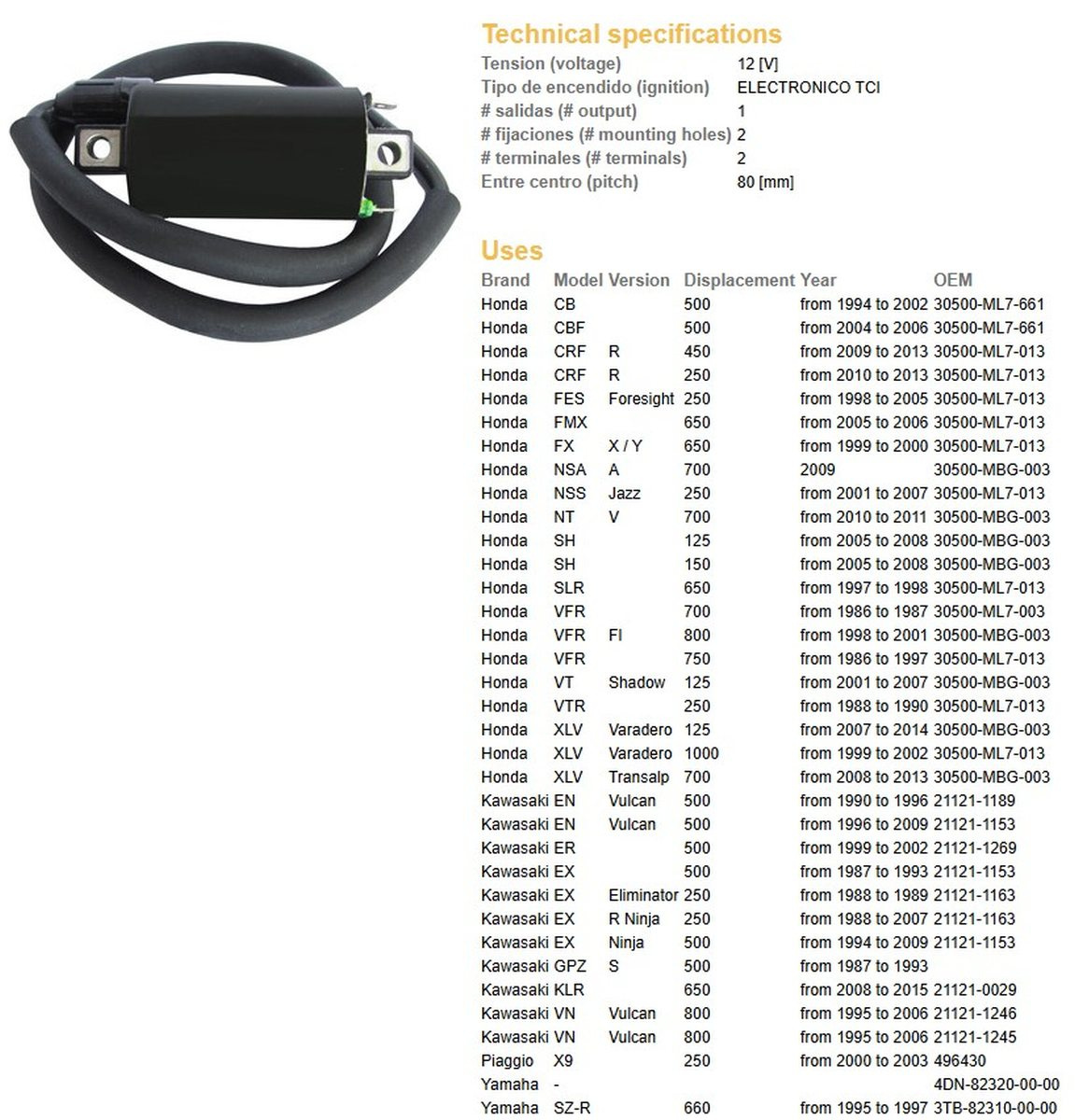 Dze cewka zapłonowa honda crf250r 10-13, crf450r 09-13, cbf500, kawasaki, yamaha xt600 '90-'97, xv125/250, tdm