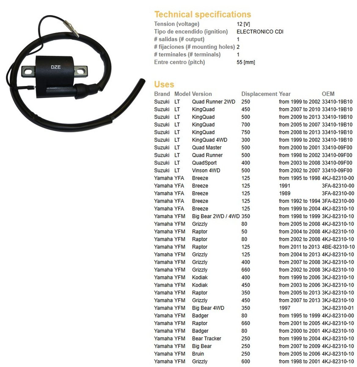 Dze cewka zapłonowa suzuki drz 400 '00-'12, king quad 700/750 '05-'13, yamaha grizzly/raptor/kodiak 350/400/450/600/660