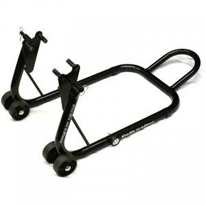 Podstawowy podnośnik motocykla pod przednie zawieszenie. Wzmacniania konstrukcja zapewni stabilny uchwyt motocykla oraz rolki (kółeczka) pozwolą na podniesienie motocykla. System mocowania opiera się na rolkach, które wkłada się pod przednie zawieszenie.