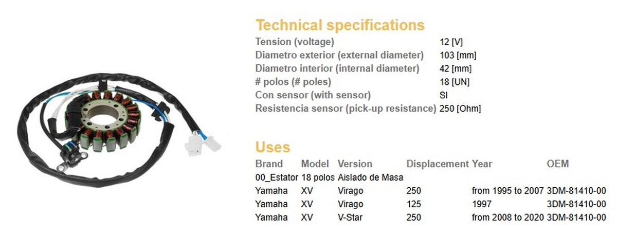 Uzwojenie alternatora stator yamaha xv 250 virago '95-07, xv 250 v-star '08-20, xv 125 virago '97, (oem 3dm-81410-00)