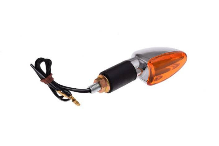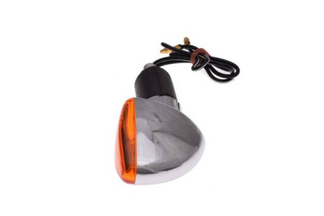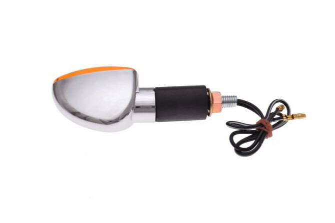 Lewy kierunkowskaz przedni o owalnym kształcie, pokryty chromem, dedykowany jest do motocykli oraz skuterów. Jest wyposażony w żarówkę typu BA9S (12V 23W), zapewniającą mocne oświetlenie dla zwiększenia widoczności na drodze.