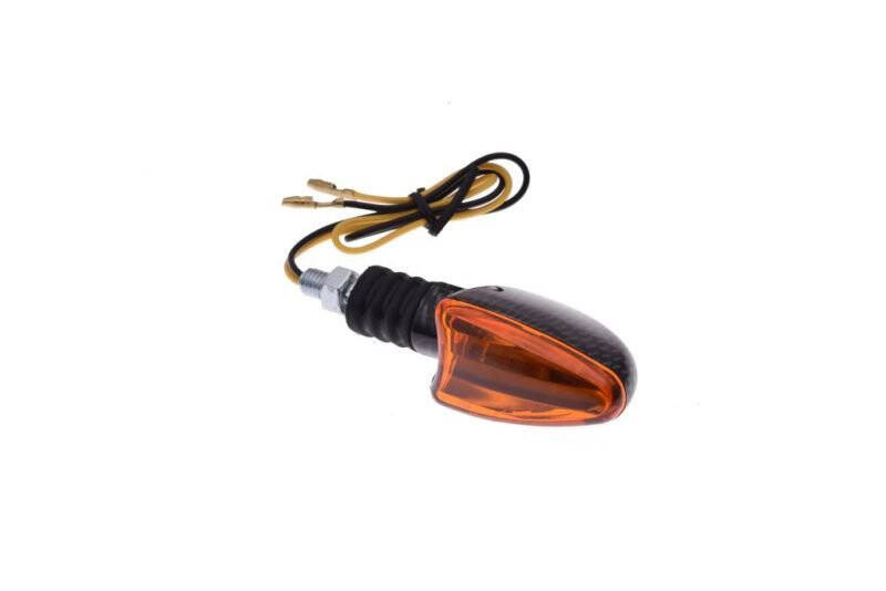 Lewy kierunkowskaz przedni w kształcie owalu z pomarańczowym kloszem i obudową carbon 12V23W.