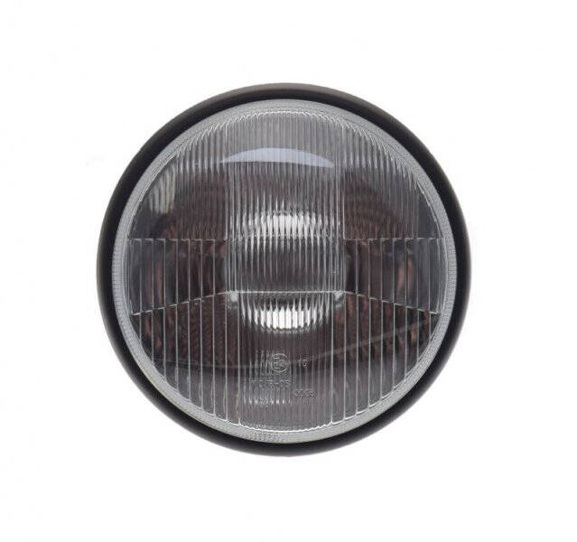 Lampa przednia E-Mark 7 cali H4 12V z homologacją do motocykli. Lampa z czarną, matową obudową oraz ramką