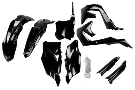 Komplet plastików (full kit) z osłonami teleskopów (amortyzatorów), przeznaczonych do motocykli Kawasaki KXF 250 (roczniki 2021-2024) oraz KXF 450 (roczniki 2019-2023). Komplet ten jest dostępny w trzech różnych kolorach, co pozwala na personalizację motocykla i dopasowanie go do preferencji użytkownika.