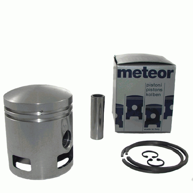 Tłoki Meteor do silników dwusuwowych wykonywane są metoda odlewania ze stopu aluminium o 18 % zawartości krzemu. Wysoka zawartość krzemu zapewnia znikomą rozszerzalność tłoka przy wysokich temperaturach dając gwarancję długiego i bezproblemowego działania tłoka w silniku , nawet w ciężkich warunkach. Odlewy tłoków są poddawane wygrzewaniu w wysokich temperaturach . Sześćdziesięcioletnie doświadczenie w produkcji tłoków pozwoliło na produkcję tłoków lekkich , wytrzymałych na zużycie , o małym wskaźniku tarcia. W celu zmniejszenia tarcia oraz przedłużenia żywotności tłoka płaszcz tłoka w procesie produkcji jest napylany warstwą molibdenu. Pierścienie tłokowe pochodzą od japońskiego producenta , lub włoskiej firmy Caber.
