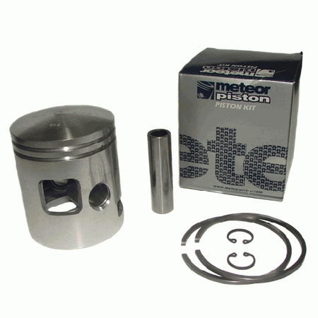 Tłoki Meteor do silników dwusuwowych wykonywane są metoda odlewania ze stopu aluminium o 18 % zawartości krzemu. Wysoka zawartość krzemu zapewnia znikomą rozszerzalność tłoka przy wysokich temperaturach dając gwarancję długiego i bezproblemowego działania tłoka w silniku , nawet w ciężkich warunkach. Odlewy tłoków są poddawane wygrzewaniu w wysokich temperaturach . Sześćdziesięcioletnie doświadczenie w produkcji tłoków pozwoliło na produkcję tłoków lekkich , wytrzymałych na zużycie , o małym wskaźniku tarcia. W celu zmniejszenia tarcia oraz przedłużenia żywotności tłoka płaszcz tłoka w procesie produkcji jest napylany warstwą molibdenu. Pierścienie tłokowe pochodzą od japońskiego producenta , lub włoskiej firmy Caber.
