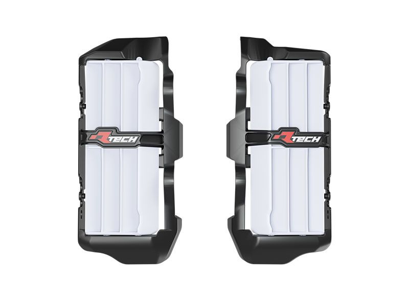 RACETECH (RTECH) 2025/12 OSŁONY (KRATKI) WLOTÓW CHŁODNIC POWIĘKSZONYCH BETA RR 125 / 200 / 250 / 300 X-PRO / RACE '25, RR 350 / 390 / 430 / 450 / 480 X-PRO / RACE '25, KOLOR CZARNY / BIAŁY to solidny produkt marki RACETECH, przeznaczony do zastosowań motocyklowych.