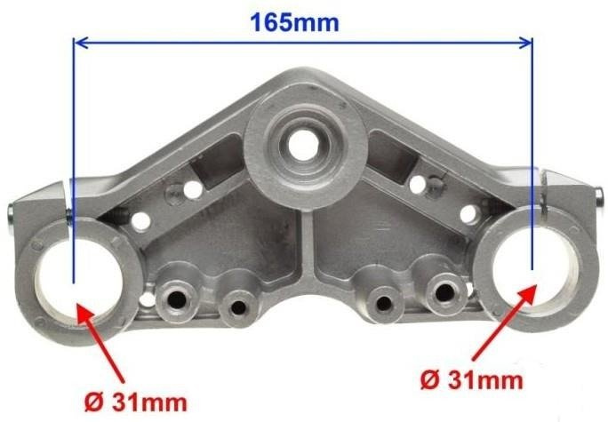Dopasowanie do amortyzatorów – średnica 31 mm oraz rozstaw otworów 165 mm zapewniają łatwy montaż i kompatybilność z oryginalnymi elementami motocykla