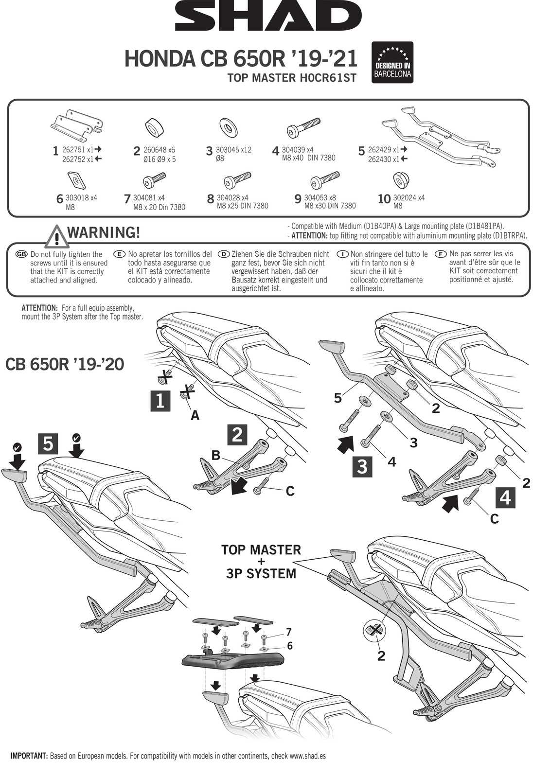 Aby zamontować kufer tylny do motocykla, konieczne jest przymocowanie do stelaża płyty dołączonej do kufrów SHAD. Płyty montażowe są dołączone do wszystkich kufrów głównych z wyjątkiem serii Terra, gdzie płytę montażową należy zakupić osobno.
