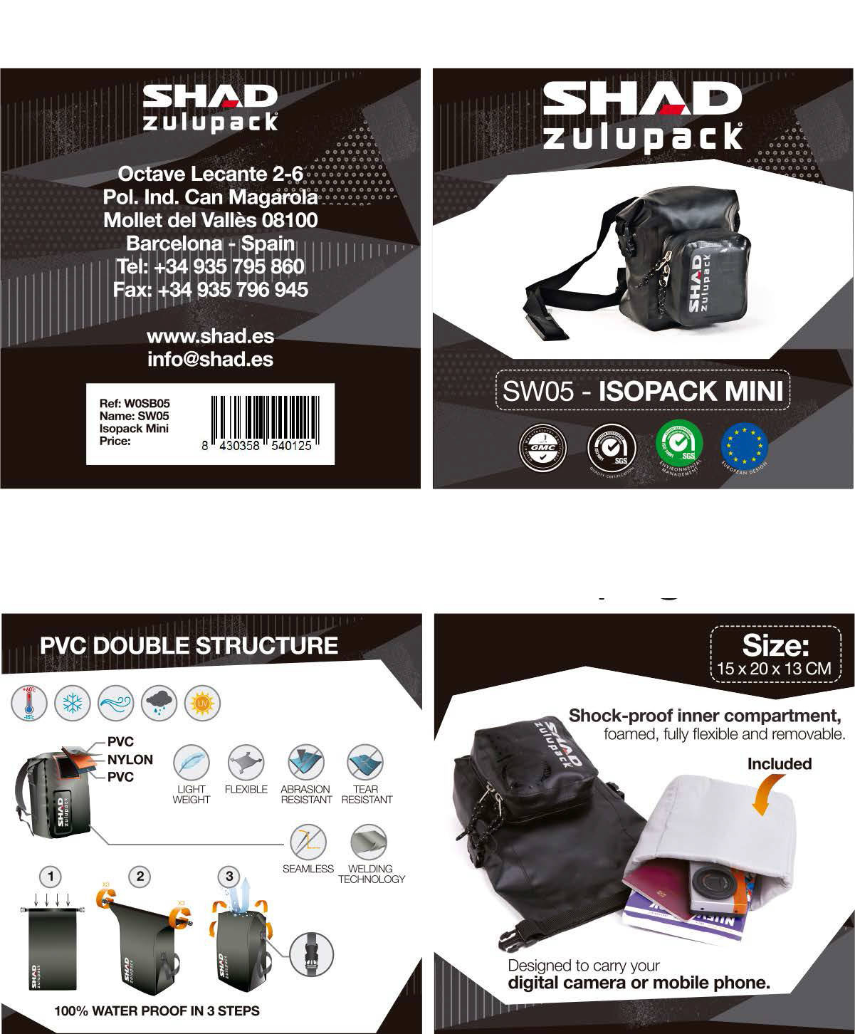 SW05 zawiera wewnętrzną wyjmowaną, wyściełaną torbę z przegrodami chroniącymi aparat/smartfon oraz przednią kieszeń zapinaną na zamek
